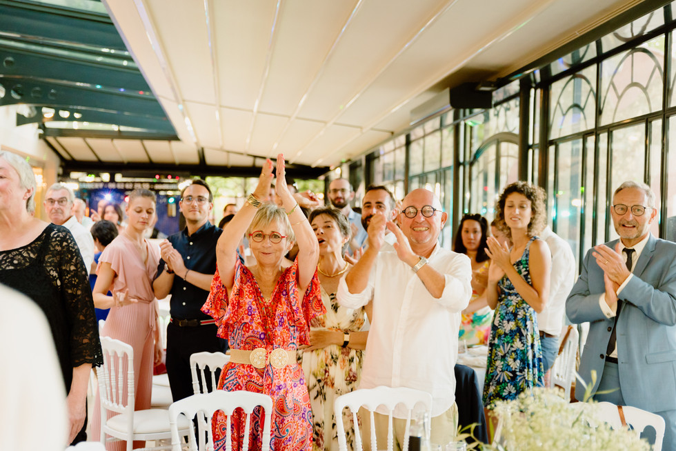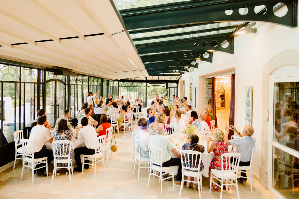 Et c'est sous un tonnerre d'applaudissement que les mariés ont rejoins leurs invités attablés sous la magnifique verrière du domaine.