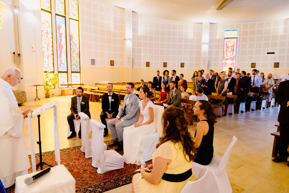 2 jours après et encore des étoiles plein les yeux, je retrouve mes 2 amoureux sur le parvis de la magnifique (et très colorée !) église Notre Dame de la Mer à la Seyne sur Mer. Une très belle cérémonie avec une sortie sous les rameaux d'oliviers.